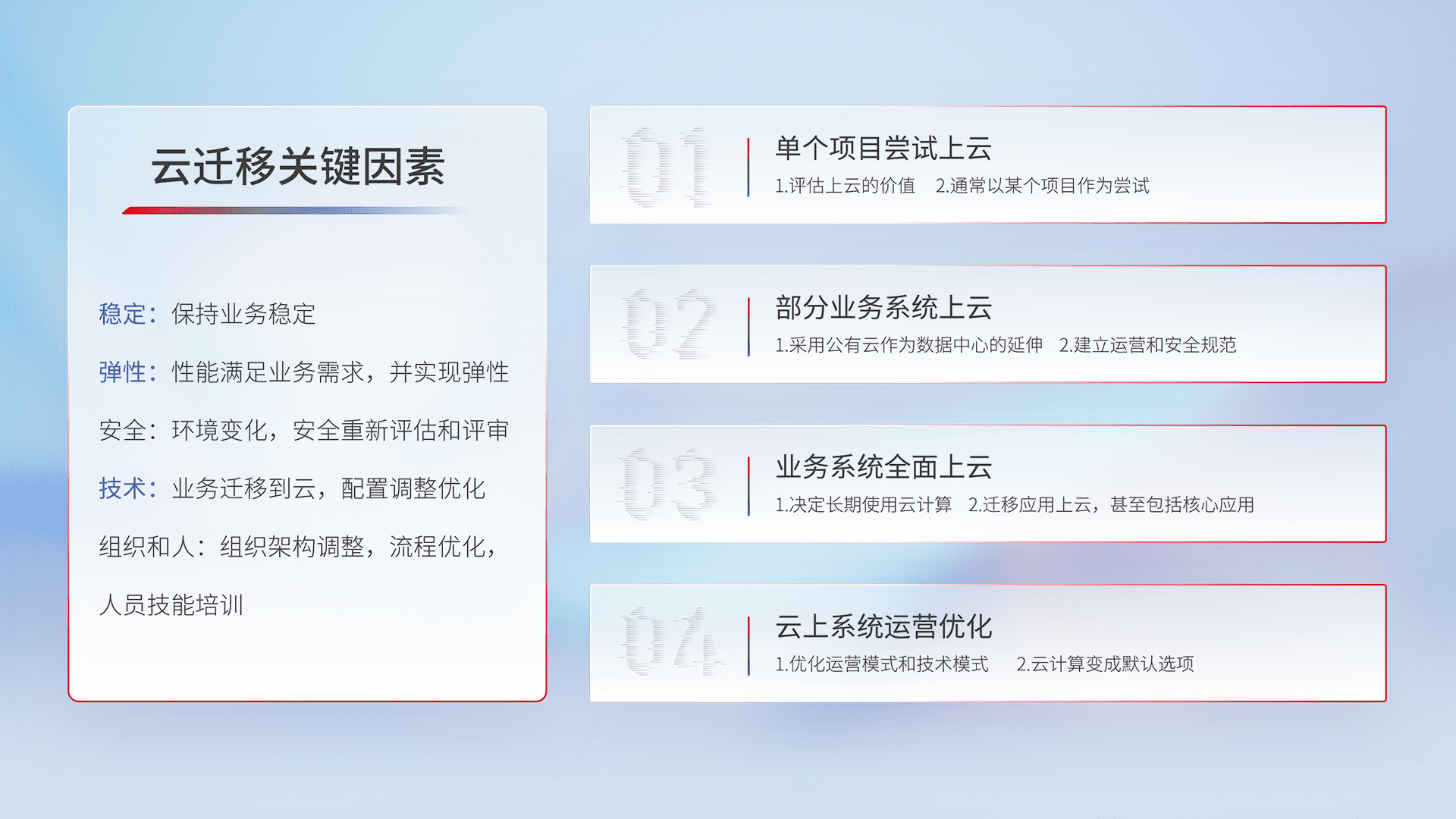 结合实际业务,,,从规划设计、、、云平台选型、、、、云原生改造、、、、数据迁移、、、、集成交付,,迁移全过程为客户识别最佳上云路径,,,做好风险识别管理,,设计网络架构、、、、身份权限、、、安全审计合规、、、操作审计、、、日志审计、、、监控告警策略、、、、多站点容灾设计等,,,,对云上基础设施进行整体规划,,,,提升IT治理水平,,,,以满足弹性、、、、高可用、、、高性能的需求。。。