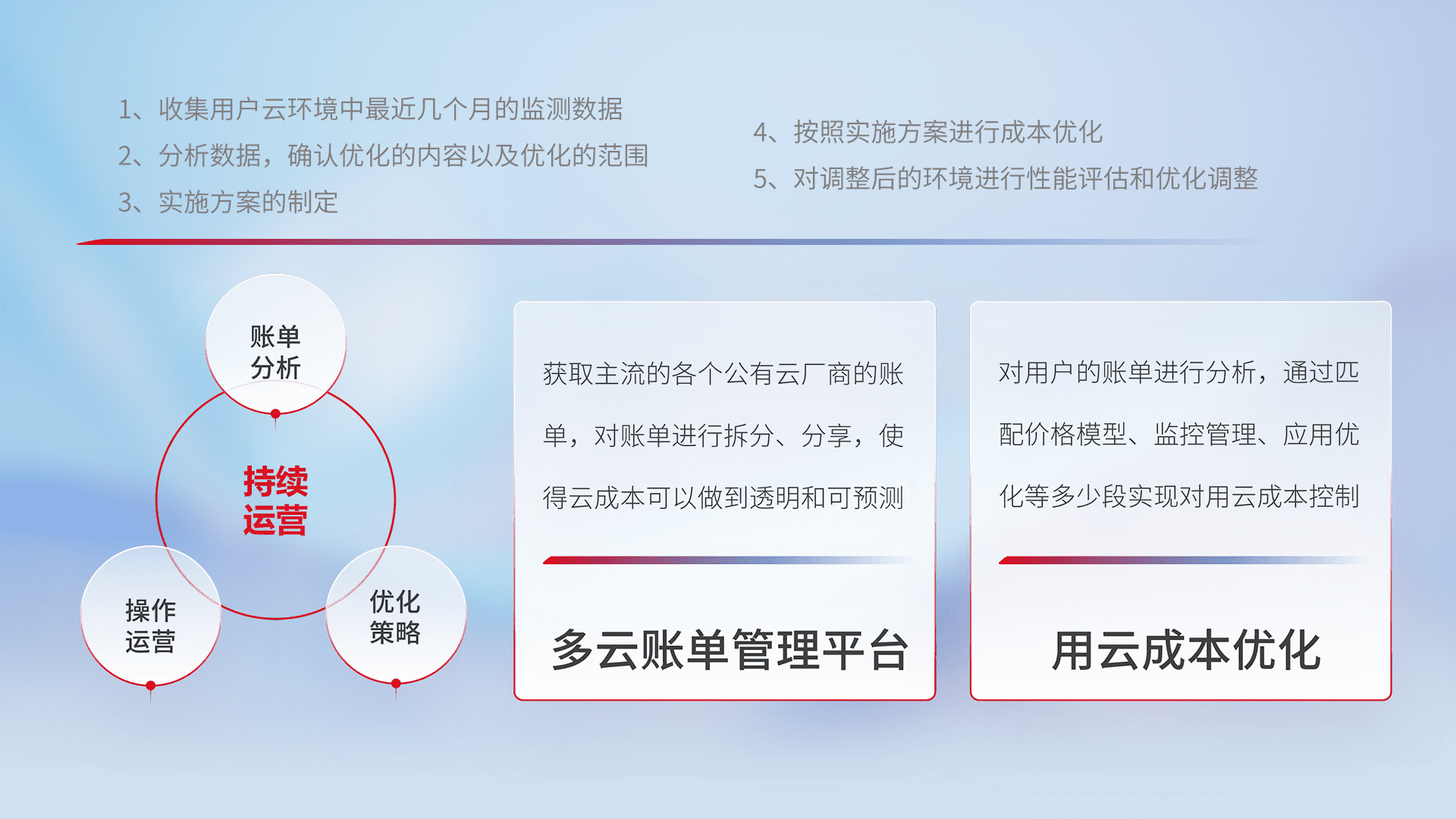 通过多云纳管,,以统一的资源数据模型把客户的云资源进行抽象和封装,,,进而实现对多云资源的统一操作,,,,保障云资源管理的可靠性、、稳定性与可用性。。。量身定制化运维内容,,,,配置、、开发运维、、、补丁管理、、、、备份、、监控、、、认证和访问管理、、、审计和日常巡检等,,保障在用云过程中的可靠度,,,稳定度以及高可用率。。